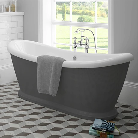 The luxury Chatsworth grey and white period style double ended curved free-standing bath, Victorian inspired design with a modern twist. The perfect focal point of any traditional bathroom, if you want to make a statement with your bath design, then choose from our luxury collection. Made with quality grey and white gloss smooth acrylic.