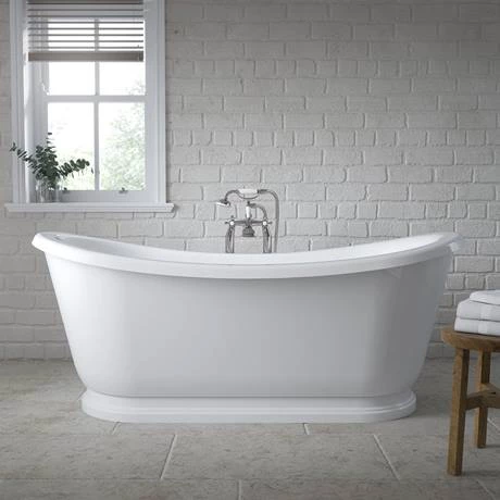 A luxury traditional double ended freestanding slipper bath with skirt from period bathroom specialists Old London. Relax and unwind in this classic freestanding bath tub, the Greenwich has been manufactured using high-grade lucite acrylic ensuring a quality finish and long lasting durability. Suitable for use with freestanding bath taps (no tap holes, not suitable for drilling). Create the ultimate centrepiece in your bathroom with Old London’s sublime bath tubs.