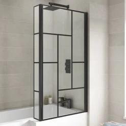 (1) Venice Matt Black Abstract Grid L-Shaped Hinged 6mm Glass Bath Screen